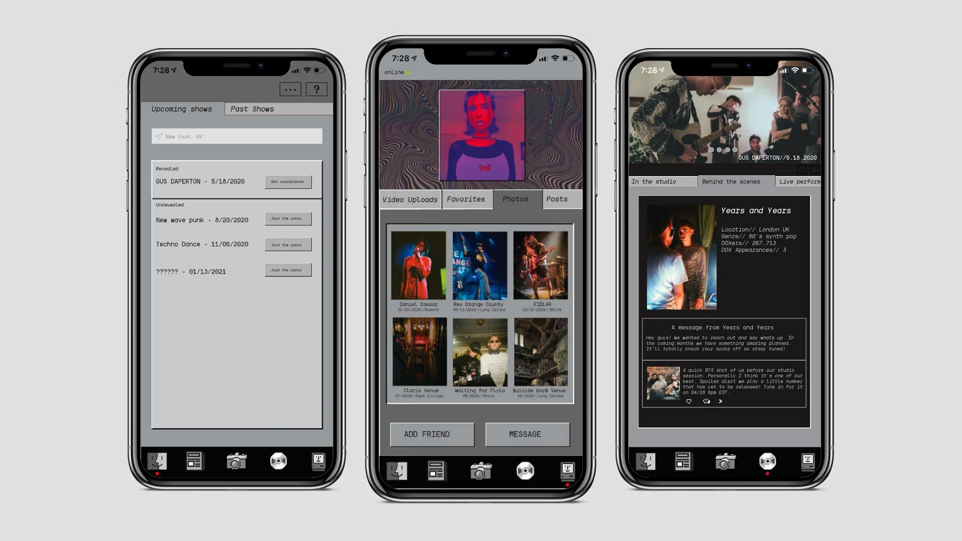Dox is a music venue that doesn't have a home. It travels around just like the up-and-coming artists through the underground scene. By having concert goers 'dox the info about the venue, it Gives the thrill of a truly exclusive concert experience.